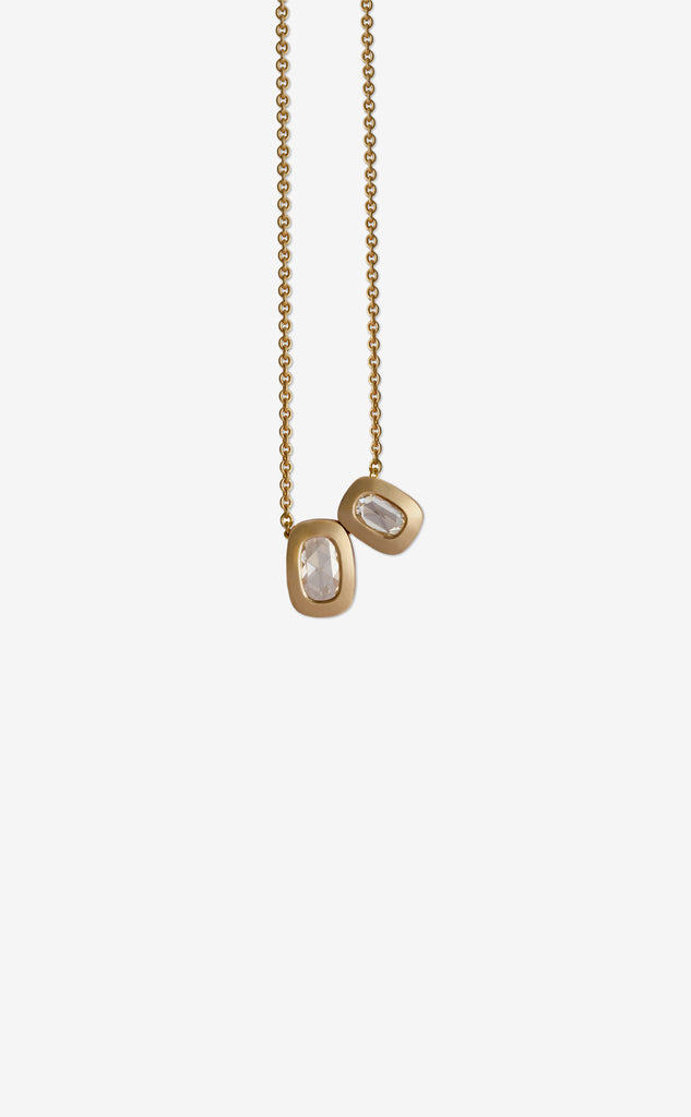 Two rose-cut colorless diamonds framed in bold bezel settings, suspended from a 14k gold cable chain.