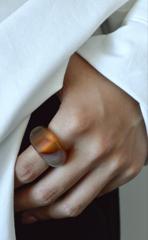 One-of-a-kind carved translucent Montana Agate band lined in fine gold